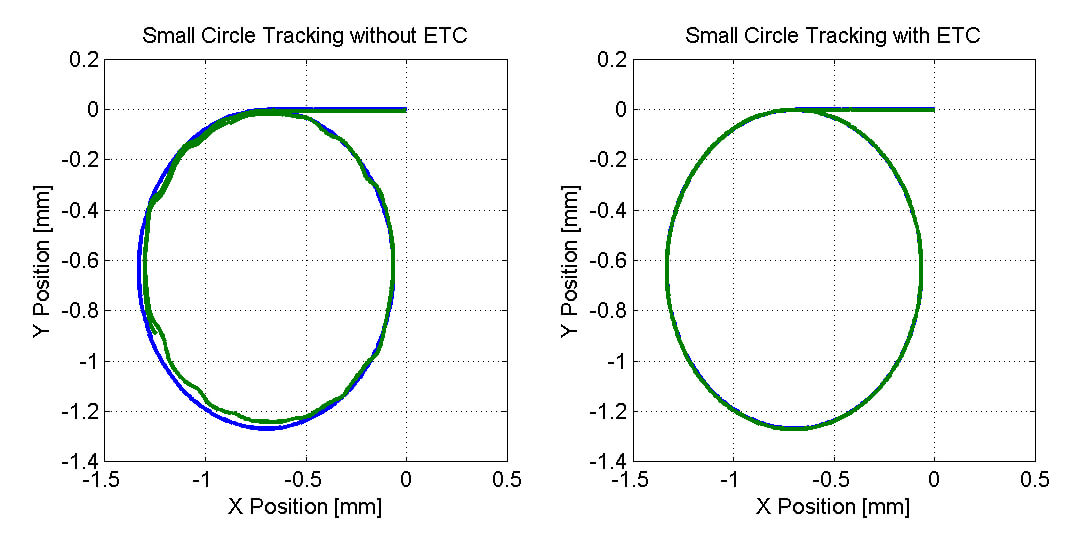 The lightweight mirrors used in high-speed laser galvanometers are especially susceptible to even the smallest disturbance forces. Even the highest quality bearings exhibit a nonlinear frictional behavior that can degrade positioning performance in precision applications. Figure 4 shows the tracking error to a command for tracing circles at a 127 Hz frequency with and without the ETC. Position error, and ultimately part quality, are improved with the algorithm enabled.