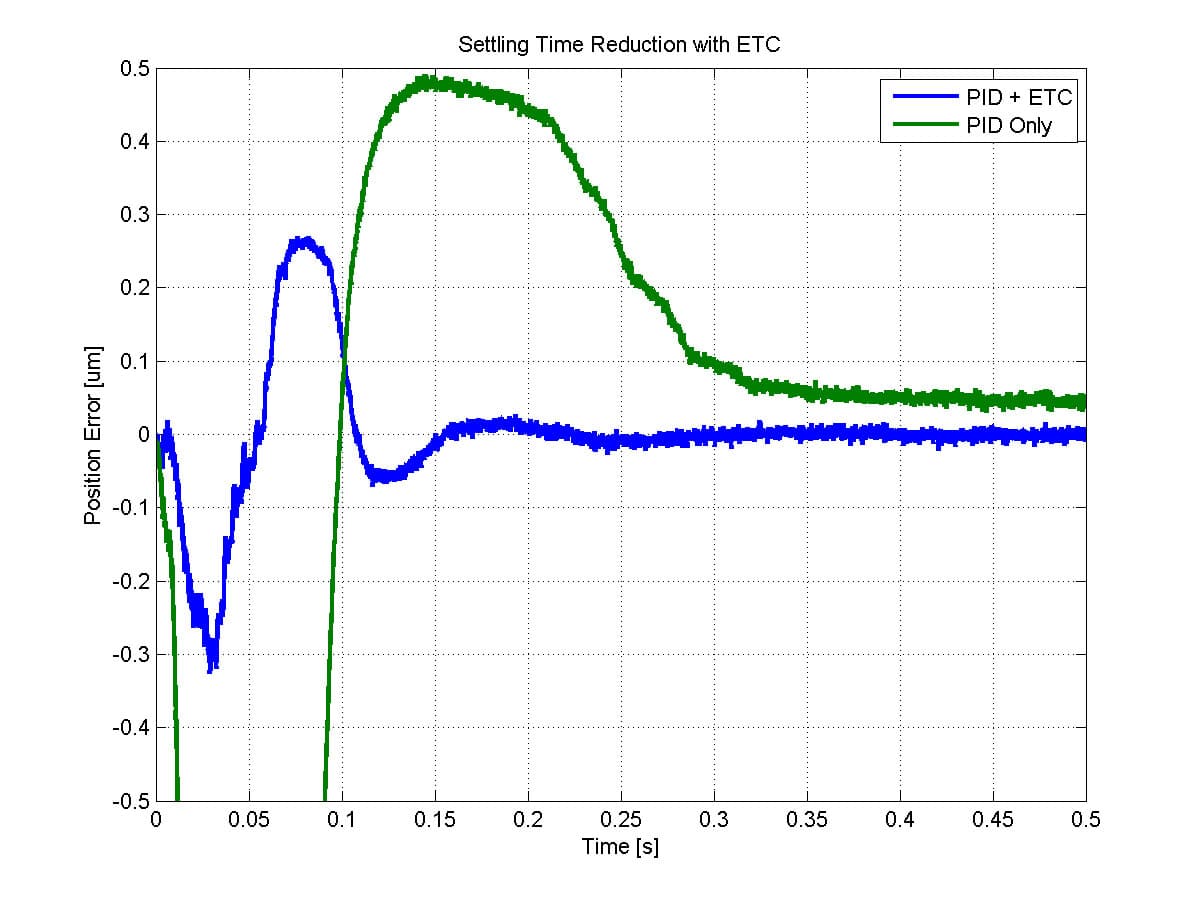 The Enhanced Tracking Control algorithm improves point-to-point positioning performance by eliminating the long tail associated with settling to sub-micron tolerances (Figure 2). Systems with rolling element bearings typically take a long time in the quasi-static condition when the rolling elements are almost, but not quite, in their final position. The higher loop gain of the servo at low frequencies provides the additional effort to push through the bearing friction when using the Enhanced Tracking Control algorithm.