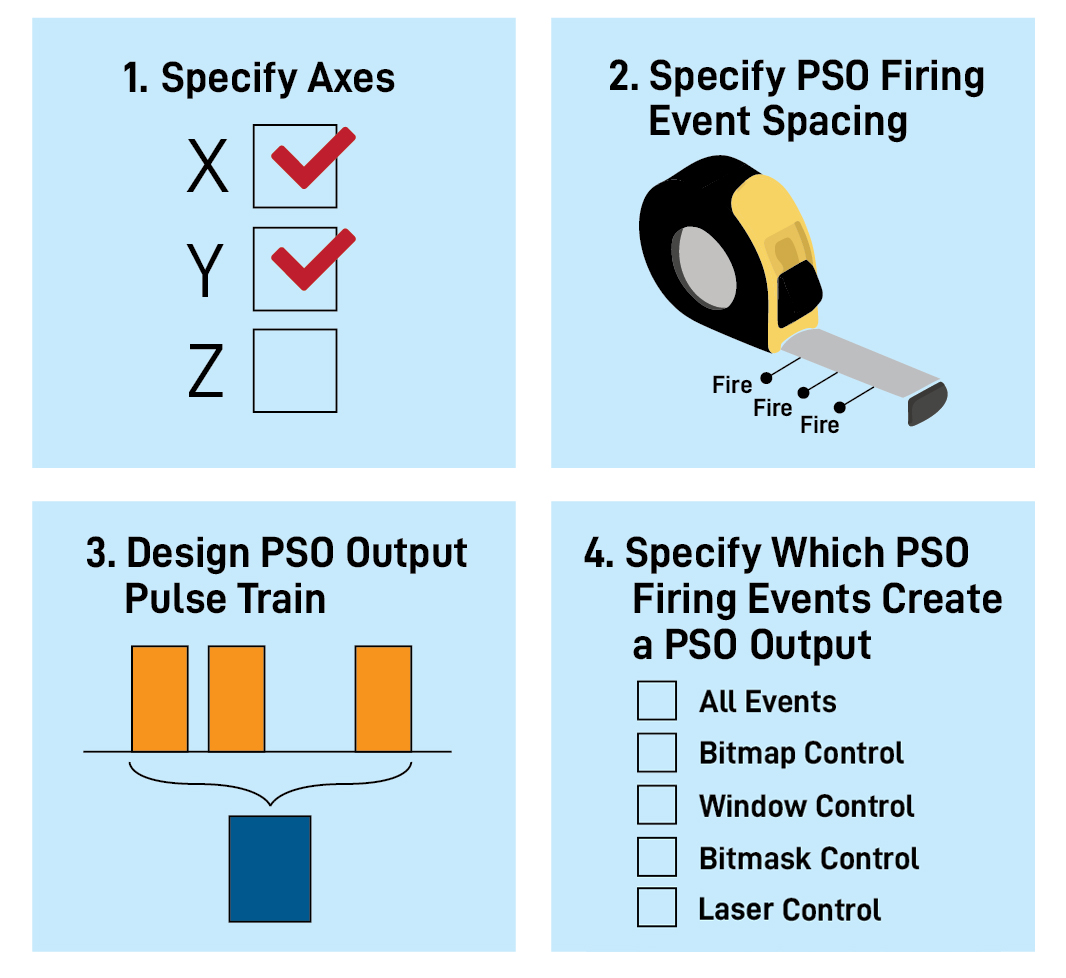 Automation1 PSO setup is easy and flexible. Setting up PSO is a matter of setting up component PSO function blocks, each with defined inputs and outputs. Think of setting up these function blocks as a four-step process implemented in Aerotech’s AeroBasic conversational programming language, as illustrated in Figure 2.
