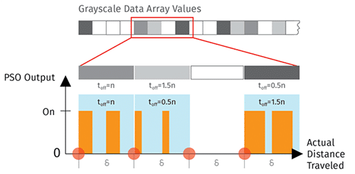 - With Bitmask Control: At all PSO firing events, but the duty-cycle of the PSO output pulse train is modified based on a grayscale array value