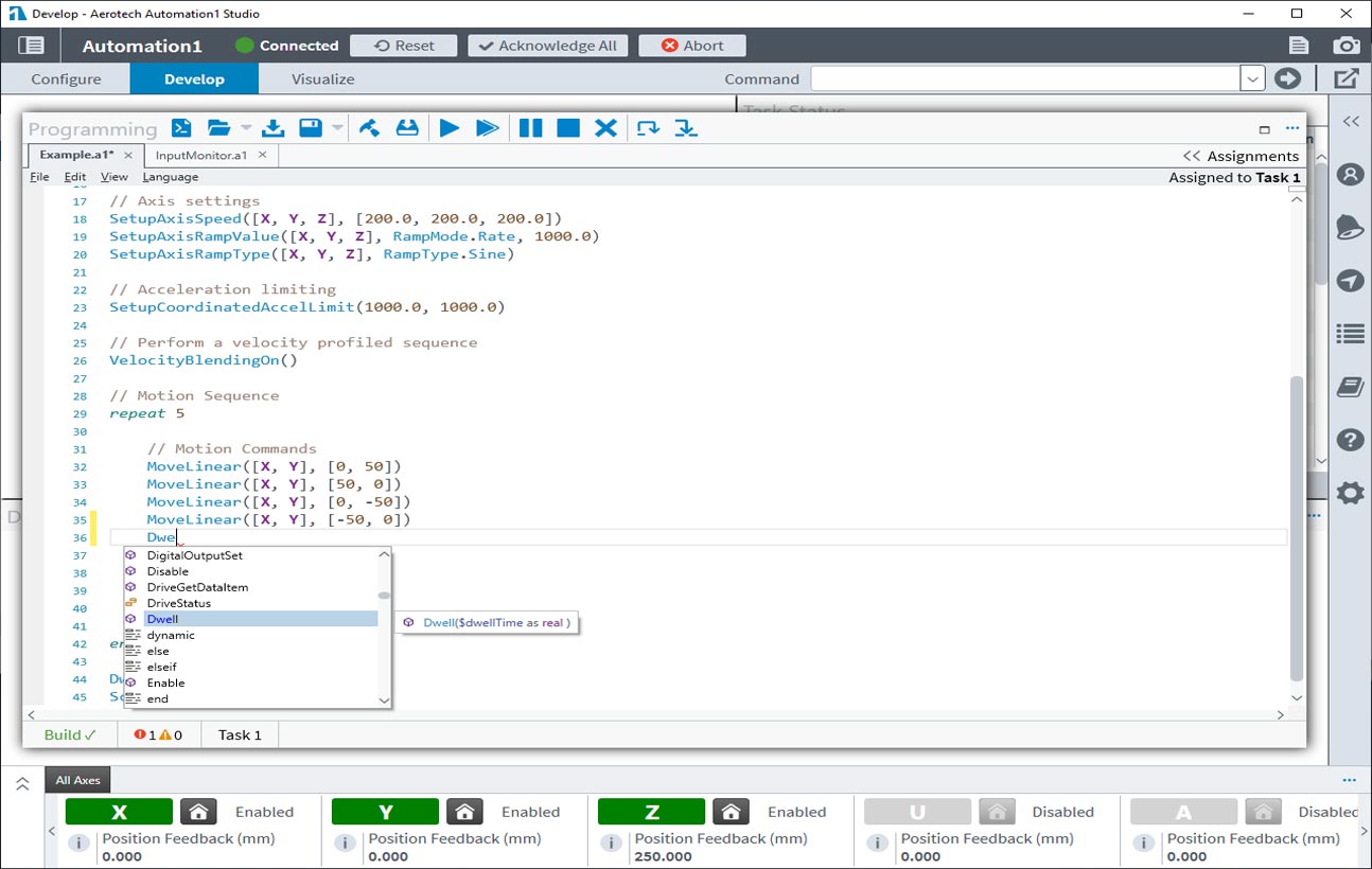 Because the iSMC integrates with our user-friendly Automation1 Motion Development Kit, you’ll quickly configure and develop your application, easily set up control devices and enjoy programming with features like intelligent autocomplete, context sensitive help, EasyTune®, live build checking, a variable and I/O watch window, and more.
