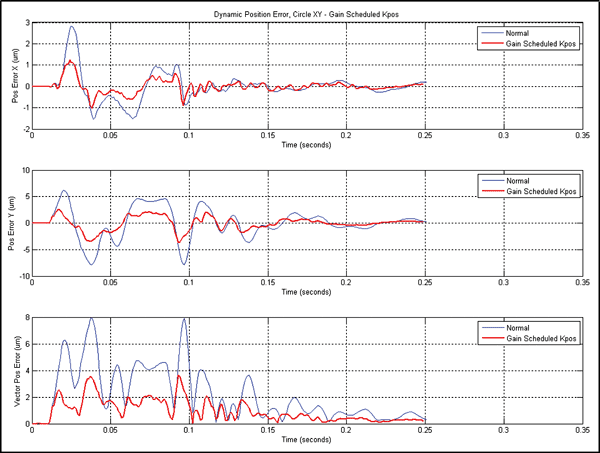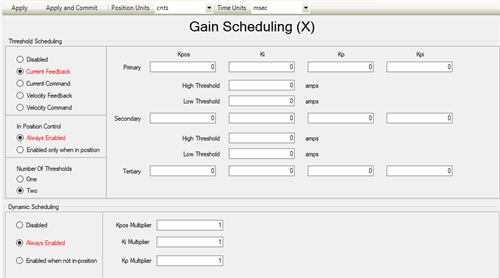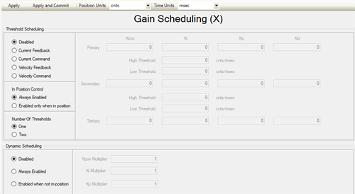 Threshold Gain Scheduling allows you to smoothly adjust gains based upon current or velocity. Simply pick multipliers for individual servo loop gains in the Dynamic Controls Toolbox GUI and enable these multipliers.