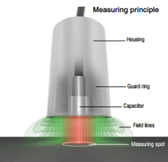 The capacitive measuring principle is based on how an ideal plate-type capacitor operates. If an alternating current of constant frequency flows through the sensor capacitor, the amplitude of the alternating voltage on the sensor is proportional to the distance to the target (ground electrode). In practice, due to the design of the sensors as guard-ring capacitors, almost ideal linear characteristics are achieved. Capacitive sensors can also measure insulated materials.