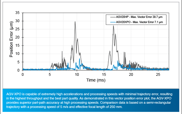 AGV-XPO, our premier two-axis laser scan head, helps to minimize the tradeoff between speed and precision. Its low-inertia, high-efficiency motors enable rapid acceleration profiles, while ultra-high resolution position feedback and optimized structural dynamics provide excellent part-profile tracking with minimal following error. Pair AGV-XPO with an Aerotech controller to enhance your process through advanced motion capabilities and coordination with other axes of motion.