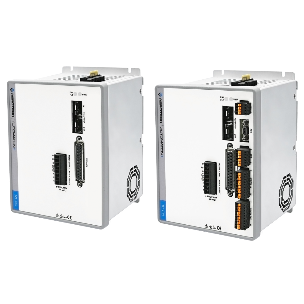 The Automation1 XR3 multi-axis drive rack can be configured with up to six individual XSL3 amplifiers. The Automation1 XL2e enhanced, compact linear servo drive is a single-axis version that uses similar technology. Both the XR3 with XSL3 amplifiers and the XL2e drive use low-noise linear power amplifiers combined with precision servo control technology to provide industry-leading in-position stability.