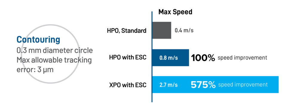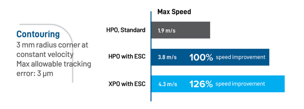 To demonstrate this, the AGV-HPO (with and without ESC enabled) and AGV-XPO (with ESC enabled) completed a profile with a 0.3 mm radius and maximum allowable tracking error of 0.003 mm. As depicted in Figure 5, the AGV-HPO without ESC performed this move at 1.9 m/s before the peak position error exceeded 0.003 mm. However, with ESC enabled the same product performed this move at 3.8 m/s before exceeding the limit, representing a 100% improvement. The AGV-XPO with ESC enabled performed this motion at 4.3 m/s, representing a 126 % improvement over the AGV-HPO without ESC.