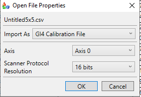 After opening the CSV file, the data can be saved as a 2D calibration file using the “Save As” option of the “File” menu with the file type set as “GI4 Calibration File”.