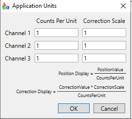 By default, all positions and correction values are displayed in counts where ‐32768 to 32767 are the full‐scale displacement of the mirrors in the scanner. The scaling can be changed to reflect user units for both the position and correction value. Select the “Change Units” item from the “Options” menu to display the Application Units dialog (Figure 3). The “Counts Per Unit” value should be set to the same value as the Automation1 CountsPerUnit axis parameter. This scale factor is used to display the measurement locations on the grid. The Application Units setting allows for the correction units to be different from the measurement units. The “Counts Per Unit” could be set‐up to reflect mm and the Correction Scale can be set‐up for microns. This allows the data to be entered into the table in more intuitive user units rather than scanner counts.