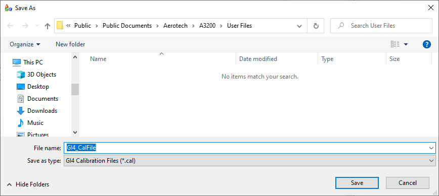 To create a Automation1-GI4 Calibration file, select the “Save As” menu item from the “File” menu, set the type as “Aerotech calibration files (*.cal)” and enter in a file name (Figure 5).