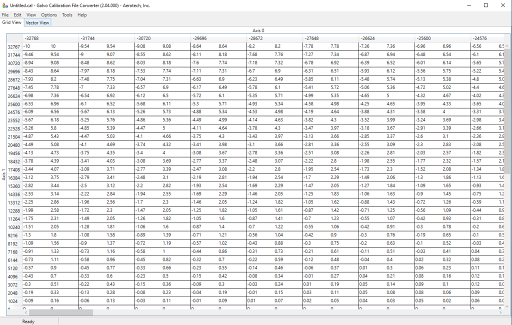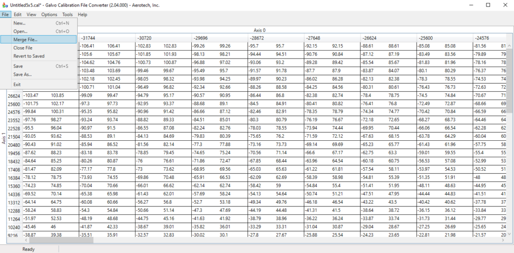 Aerotech’s Galvo Calibration File Converter (GCFC) application can be used to merge measurement data during the calibration process. The measurement resolutions of the tables to be merged do not have to match as GCFC will interpolate the correction values of the lower resolution table to match those of the higher resolution table.