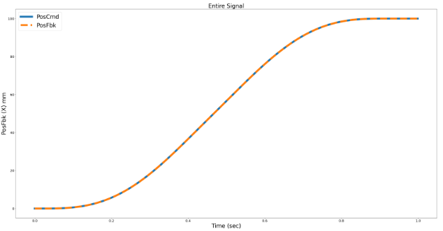 plt.legend(fontsize = font_size)For this script, the following plot (figure 2) is collected. Because this command was run on a virtual (not real) axis of motion, the position feedback (PosFbk) matches the position command (PosCmd) perfectly.