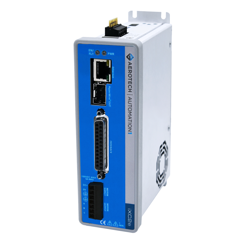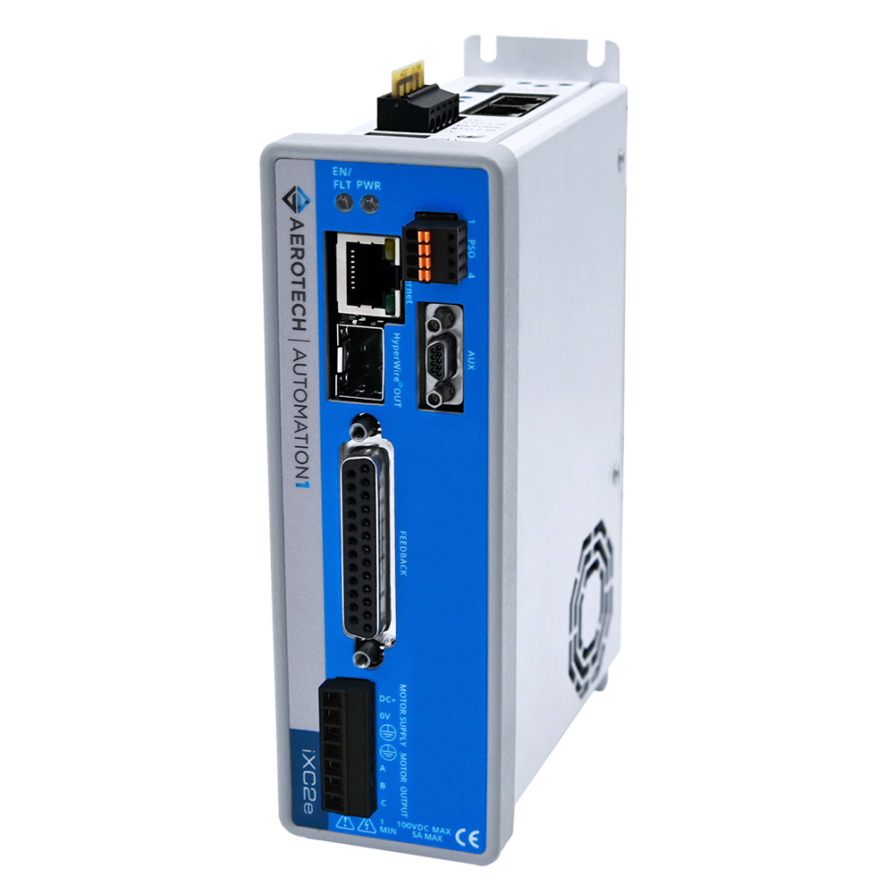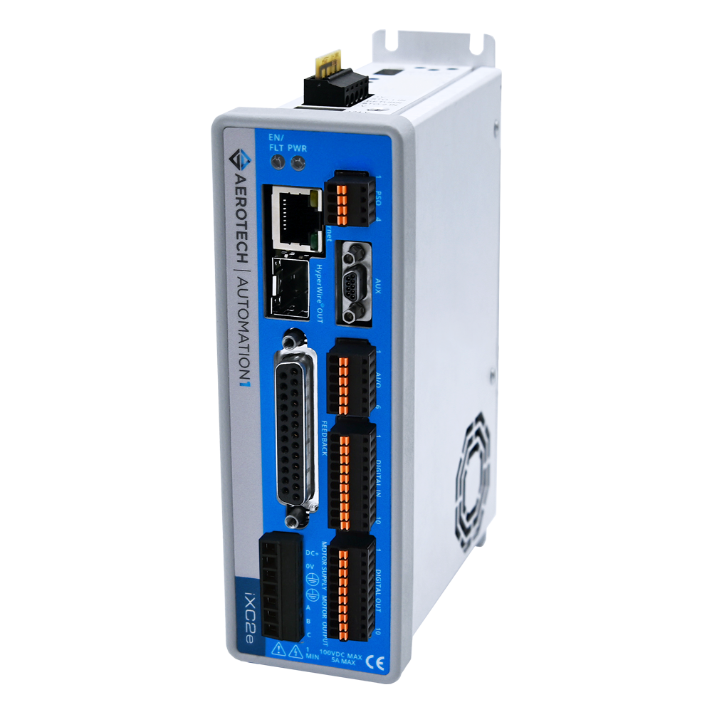 Our high-performance, compact Automation1 iXC2e PWM servo motor drive with integrated motion controller runs the full Automation1-iSMC motion controller, offers sub-nanometer levels of position control for servo motors and stages, connects to other Automation1 drives over HyperWire and connects to other automation devices over EtherCAT, Modbus TCP/IP or a TCP Socket interface. The silicon carbide (SiC) power amplifiers feature ultra-precise PWM switching, enabling excellent motor control performance. Multi-axis PSO enables precision control of your industrial laser or process tool synchronized with your motion trajectory.