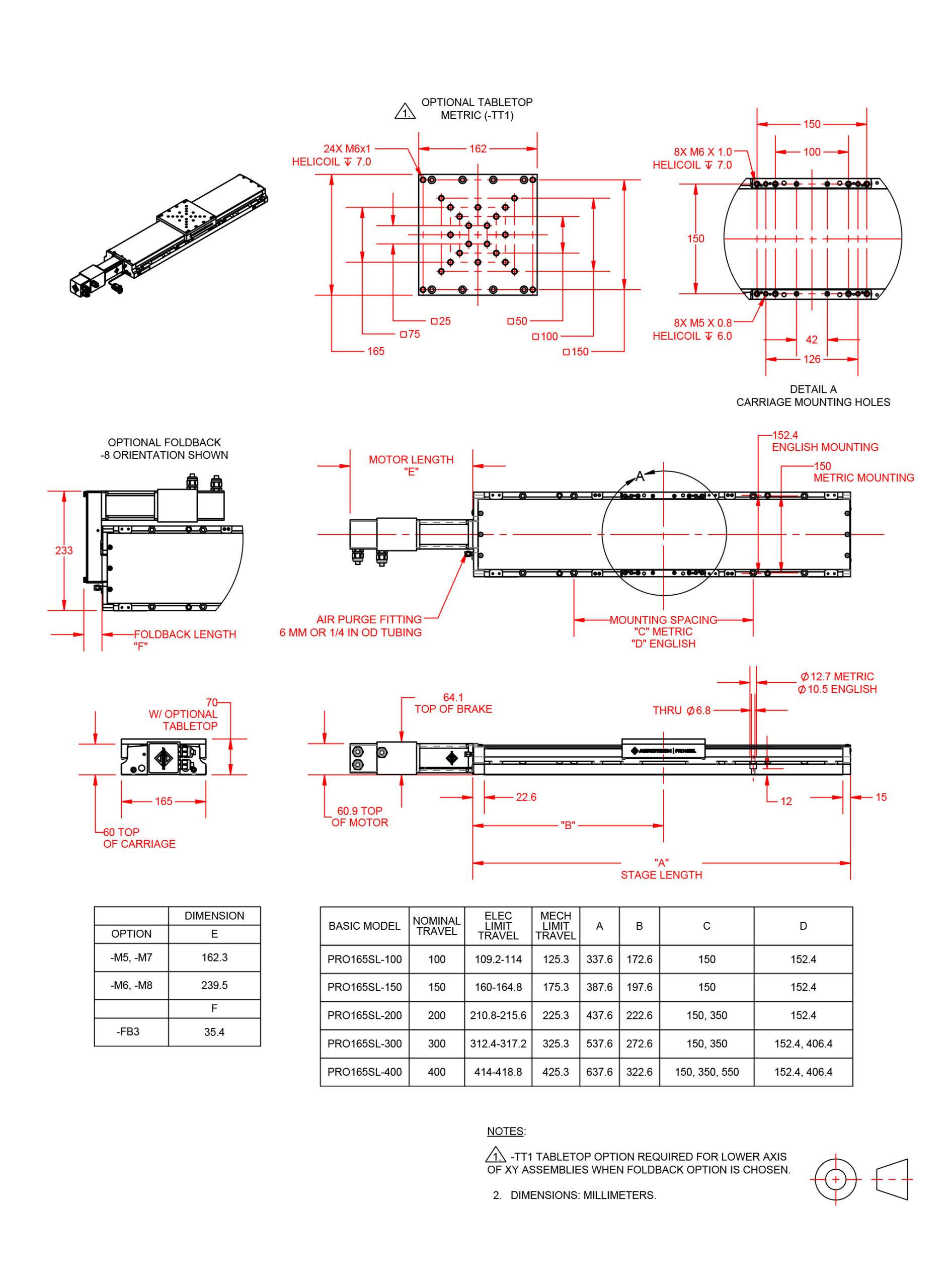 - Lifting option only available on travels 400 mm and greater. Lifting should never be ordered on the upper-axis of an XY set (only order on lower-axis).
