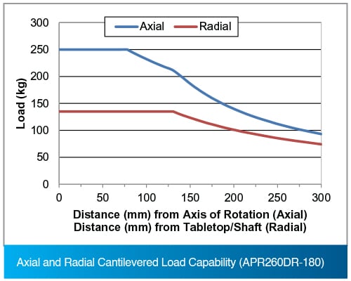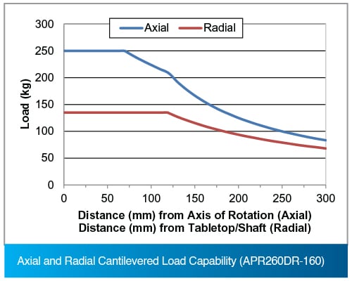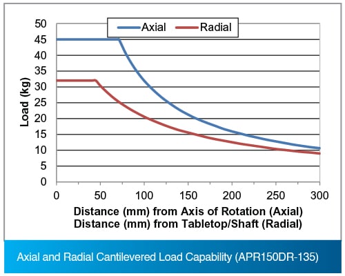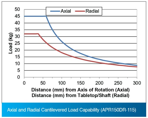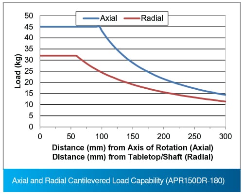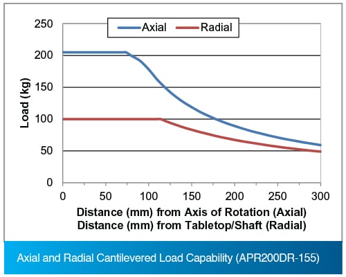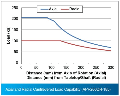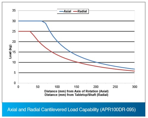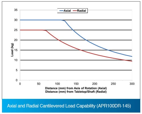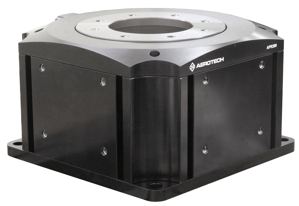 Sturdy stage construction and separated angular contact bearings result in large load capacity and high moment stiffness for the APR stages. The APRs can excel in applications where the rotation axis is parallel or perpendicular to gravity and the payload center of gravity is cantilevered away from the stage.