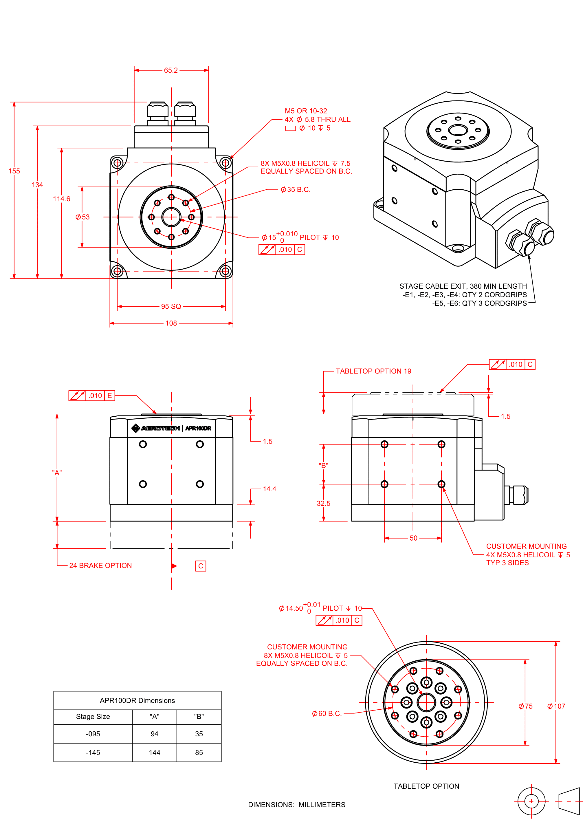 On standard APR stages, the payload is mounted directly to the precision-ground stage shaft via an eight-bolt hole pattern on the top of the shaft. The top surface and the aperture of the shaft are precision–machined for minimal surface runout with respect to stage motion. Precision-ground tabletop options provide more traditional metric or English hole-patterns while maintaining low surface runout of the tabletop mounting surface and aperture.