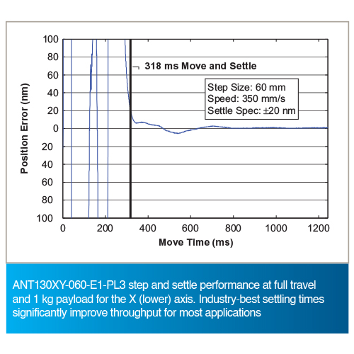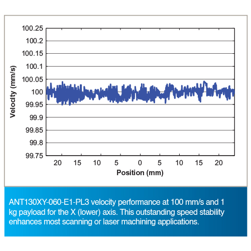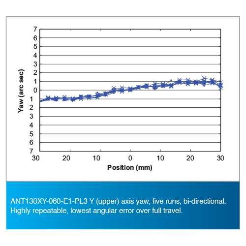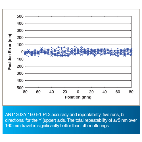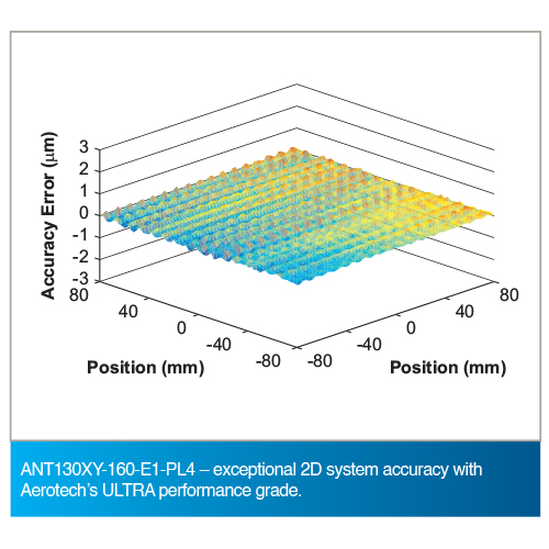In order to achieve the highest possible system accuracy from our multi-axis nanopositioning systems, we’ve developed an advanced, dynamic trajectory calibration system. To take advantage of this sophisticated calibration system, the mechanical system is completely assembled, functionally tested and calibrated in our best-in-class metrology labs. Nanometer-level system accuracy can only be achieved under stringent environmental conditions that ensure calibration with the best test equipment, using the highest-precision mechanical elements and ULTRA software capabilities of our industry-leading controls. By implementing ULTRA dynamic trajectory calibration with the ANT130XY, we are able to produce guaranteed two-dimensional accuracies of ±225 nm or better.