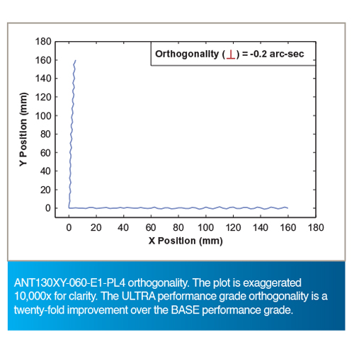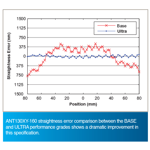 The plots provided in the specifications illustrate performance differences between a standard ANT130XY and the ULTRA version. ULTRA calibration virtually eliminates straightness, orthogonality and accuracy errors resulting from yaw.