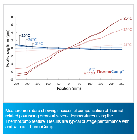 Temperature changes and thermal effects are among the largest and most challenging sources of error in precision machines. Our ThermoComp® feature minimizes thermally-induced positioning errors, so you can focus entirely on your mission. This embedded temperature compensation unit helps to protect your process from temperature swings and heating effects, even in the most extreme industrial environments.