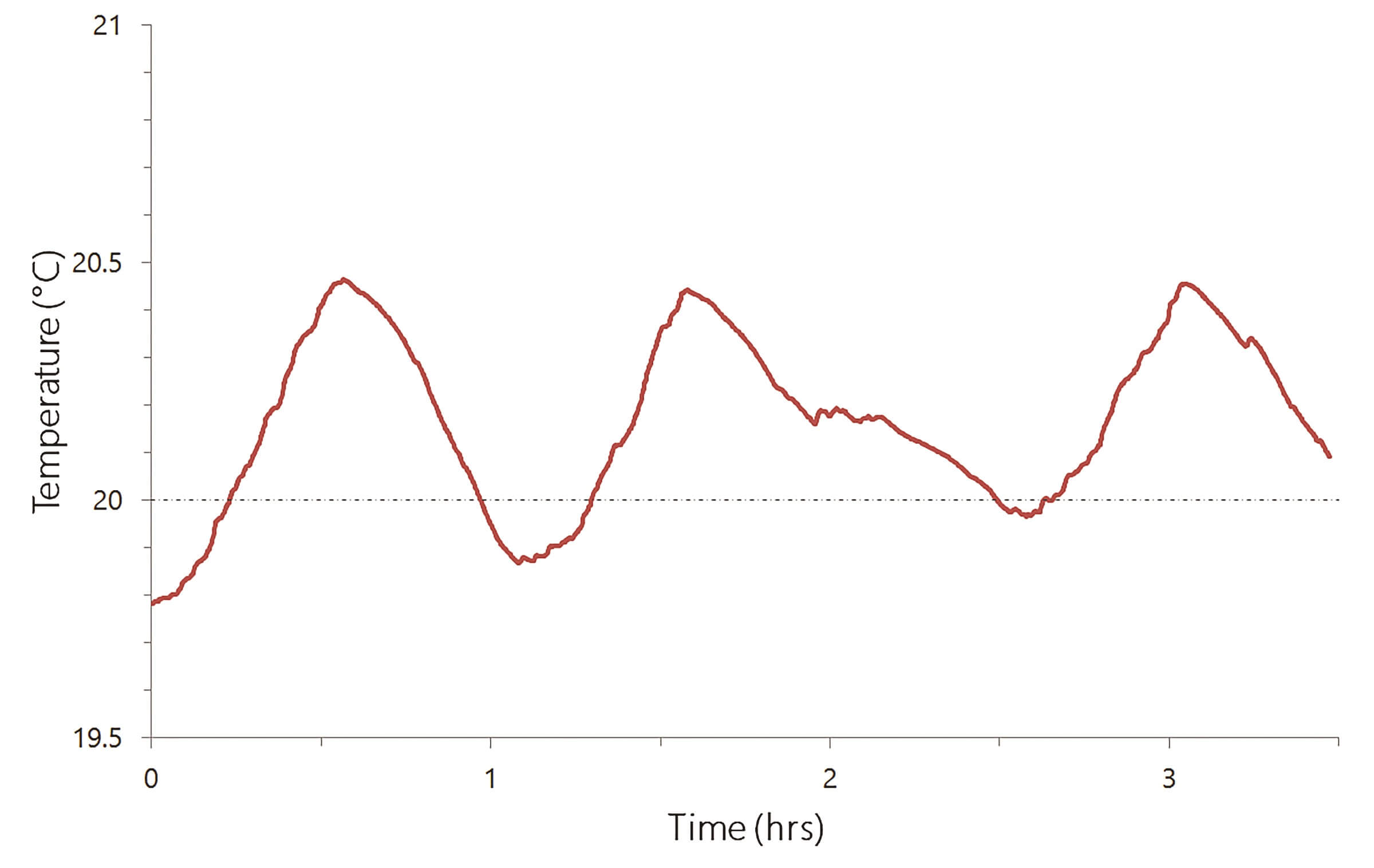 The level of environmental stability achieved in most industrial facilities, even where great expense and care is taken to regulate the building’s air conditioning systems, can be wholly inadequate for many high-precision manufacturing processes. Figure 1 shows the temperature stability of a typical lab-grade industrial facility, showing variations upwards of 0.5°C over the course of one hour. Not only will the average environment vary with time, but significant gradients can occur across the volume of a production facility. Multiple air-conditioning units are used in symphony in large facilities, causing spatially varying environmental dynamics across the production floor. This affects not only each machine’s output quality with time, but also the quality output from machine to machine.