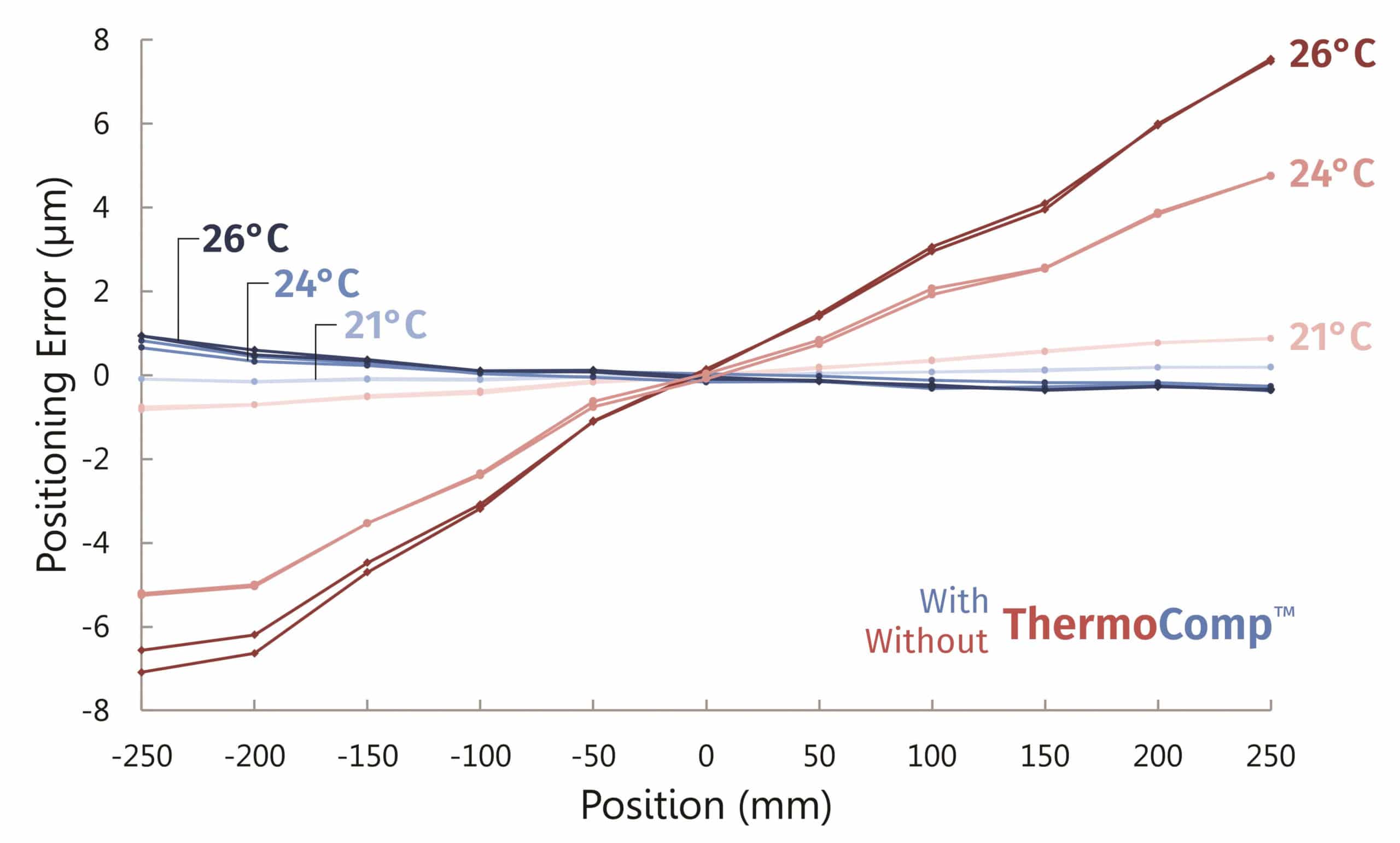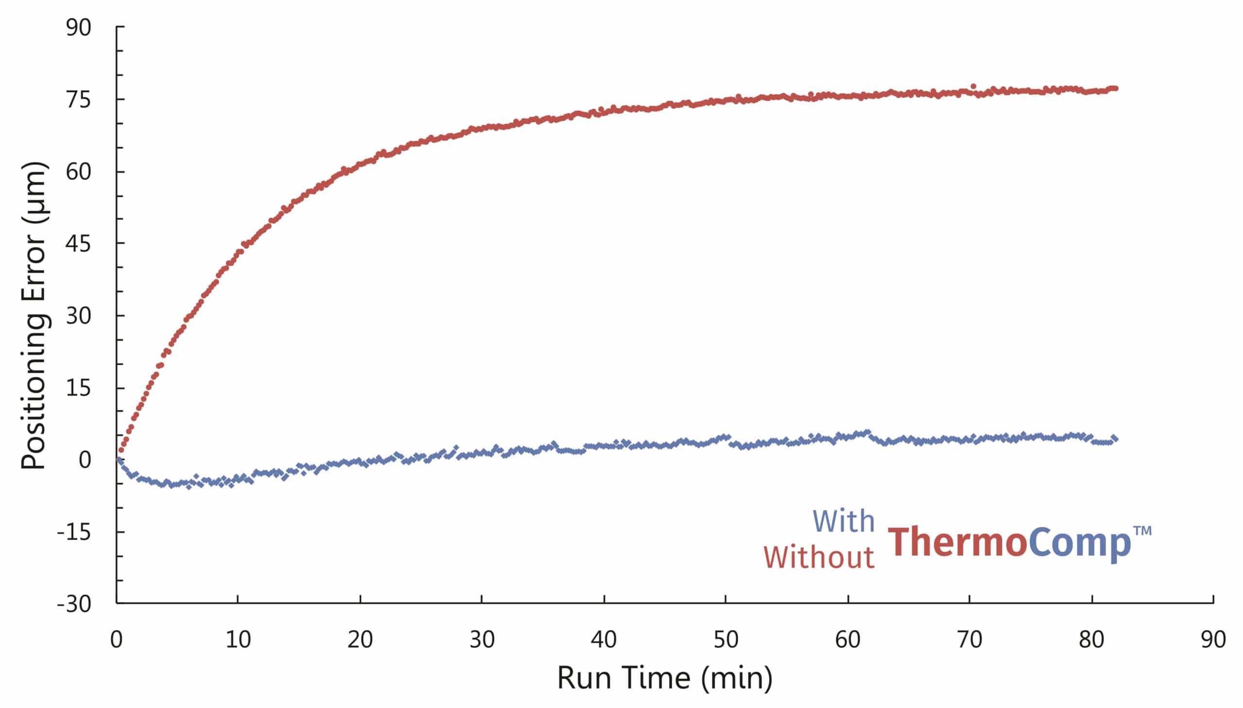 Lastly, external environmental changes aren’t the only thermal influencer on positioning error. Internal self-heating is another major source of thermal-related positioning errors, particularly in stages without direct feedback devices such as ballscrew-driven stages. ThermoComp not only prevents environmental changes from affecting positioning performance, but also diminishes the errors caused through internal heating. Figure 4 shows the successful elimination of over 94% of the thermal related errors caused by the self-heating of a ballscrew-driven stage.